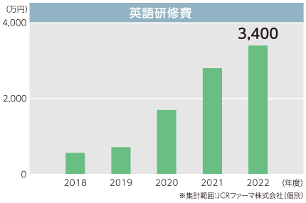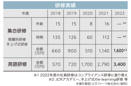 JCRでは、社員の成長が会社の発展へつながるという観点から、社員研修に注力しています。新入社員および各階層別の研修を定期的に開催するほか、社員の自己研鑽や成長を支援するために、英語研修ならびに、2020年度からは自発的に参加意思が表明できる手上げ式研修やe-learningを取り入れました。研修の実施形式も、外部講師を招いた集合研修形式、社外で実施されている公開講座への参加など、社員のニーズや受講しやすさを考慮しています。英語研修においても集合形式、Web形式等、様々な内容・形式で実施しています。