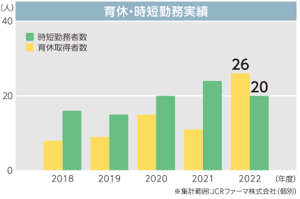 育児を行っている社員に対して、研究所内において事業所内保育所を設置しています。また、勤務地の関係で事業所内保育所を利用できない社員に対しては、毎月「保育補助金」を支給し、バックアップしています。これらの取り組み等が評価され、2022年9月に厚生労働省より「くるみん認定」を取得しました。JCRの認定取得は2018年に続いて2期連続となります。