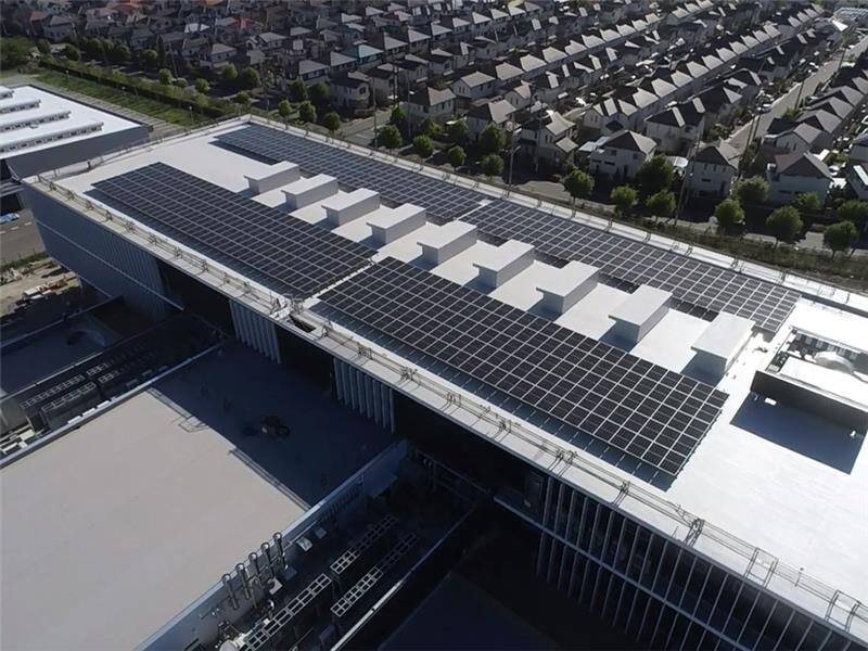 Solar power generation panels that have been installed over the entire roof of the Kobe Science Park Center office building