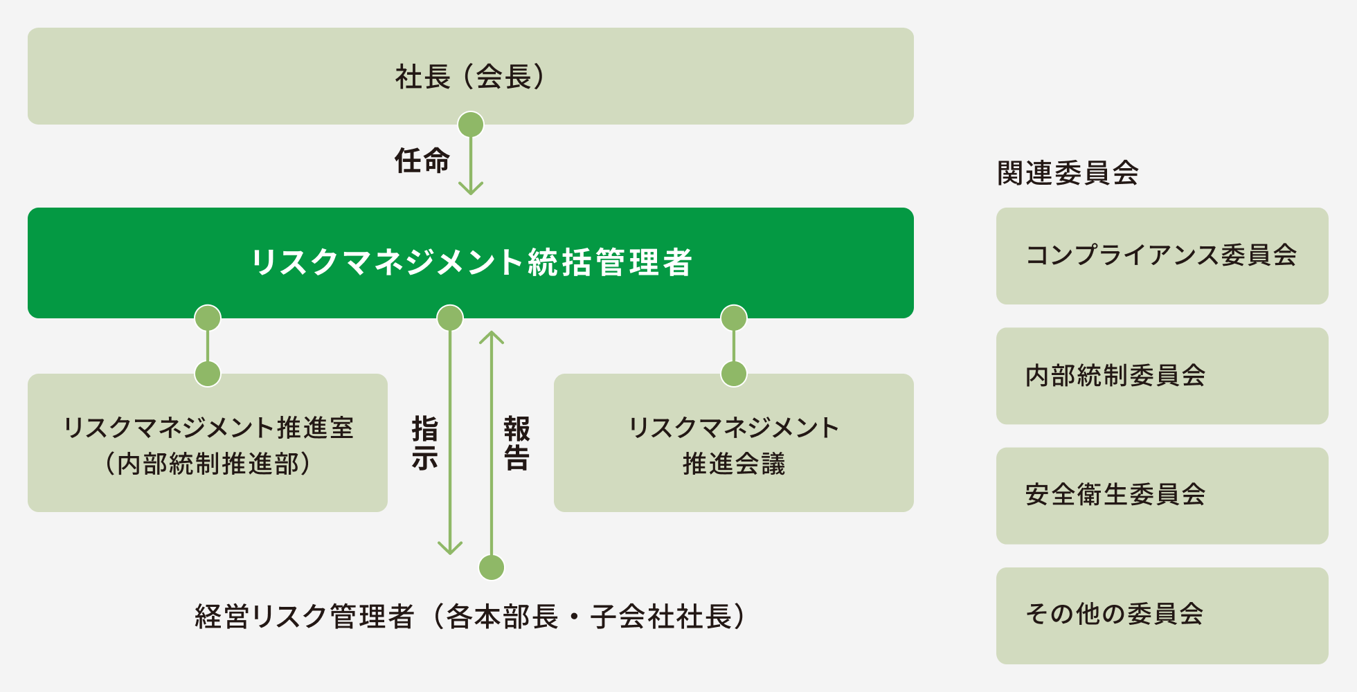 JCRは、社長から任命されたリスクマネジメント統括管理者のもと、各本部長(本部制ではない部門については部門長)ならびに子会社社長を経営リスク管理者として構成するリスクマネジメント推進会議を設置しています。リスクマネジメント推進会議は、JCRのリスクマネジメント推進のため、定期的に会議を開催し、各部門等におけるリスクマネジメント活動の集約や全社的なリスク発生の予防、事業継続計画(Business Continuity Plan: BCP)の策定などを行っています。