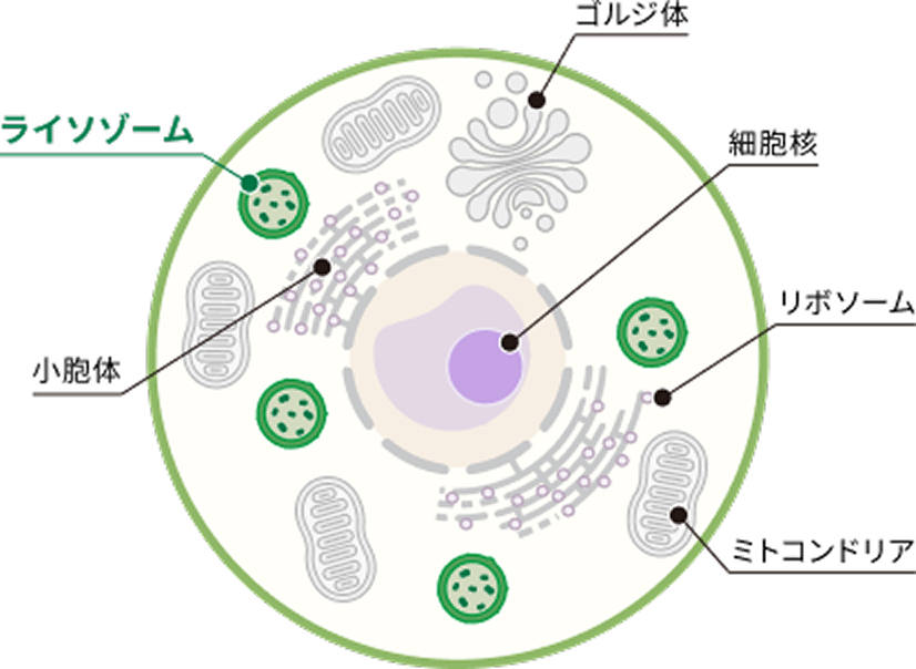 ライソゾームは細胞の中で不要となった物質を整理・分解する役割を担う細胞内小器官で、生体内の老廃物がこのライソゾームにある「酵素」で分解され、代謝されます。